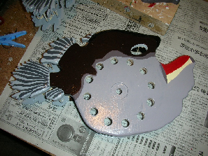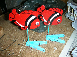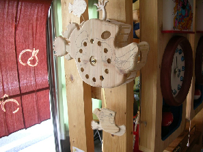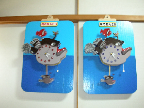 上の振り子はあんこうの提灯(誘引突起・疑似餌)に小魚が誘われて近づいている様子を表現しています。下の振り子はあんこうの子供です。口が動きます。