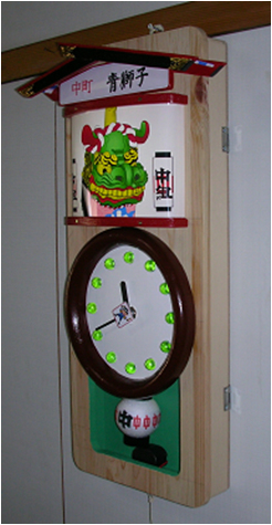6、内部にLEDが設置されており時計下部のヒモ(スイッチ)を引くと絵と時刻玉が光ります。
